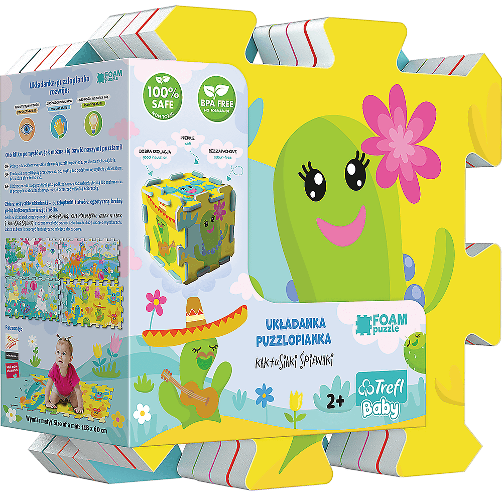 Układanka puzzlopianka Kaktusiaki Śpiewaki to zestaw dużych, miękkich, kolorowych puzzli. Ułożycie z tych mięciutkich puzzli nie tylko obrazek, ale również możecie budować figury przestrzenne, np. kostkę lub pudełko. To nie jedyne zastosowanie piankowych puzzli. Wykorzystaj je również jako miękka mata na podłogę podczas zabawy najmłodszych. Zabawka uczy spostrzegawczości, rozpoznawania kolorów i kształtów, budowania figur przestrzennych, zabawy z wyobraźnią. Dla zachowania czystości puzzle piankowe można przetrzeć mokrą ściereczką.