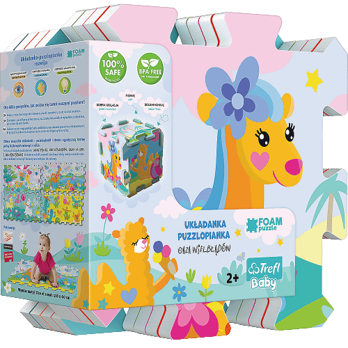 Układanka puzzlopianka Oaza wielbłądów to duże, miękkie, kolorowe puzzle, z których można budować figury przestrzenne, np. kostkę lub pudełko. Mogą również posłużyć jako podkładka przy innych zabawach. Układanka uczy spostrzegawczości, rozpoznawania kolorów i kształtów, budowania figur przestrzennych. Puzzlopianki można łatwo myć.