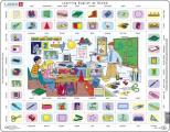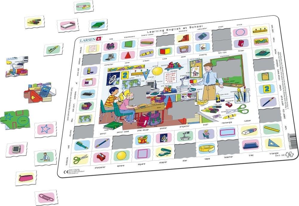 Układanka dla dzieci - puzzle ramkowe Wymiary obrazka po ułożeniu - 36 x 28 cm Wiek 5+ Naucz się 52 słów w języku angielskim dzięki tej edukacyjnej układance. W środku znajduje się mała układanka z 18 elementami i stałą ramką wokół elementów. Na puzzlach znajduje się rysunek ze szkoły oraz 52 słowa w języku angielskim określające rzeczy, które widzisz na rysunku. Te same 52 słowa znajdują się na ramce na zewnątrz, a na zewnątrz znajdują się 52 sztuki z obrazem każdej z rzeczy. Każdy z elementów z rzeczą należy umieścić obok słowa oznaczającego rzecz. Najpierw umieść kawałki z rzeczami obok słów, które znasz. Następnie ułóż układankę na środku, a tutaj znajdziesz angielskie słowa, których jeszcze się nie nauczyłeś. Następnie możesz łatwo umieścić resztę elementów na miejscu. Po kilku razach będziesz pamiętał nowe słowa, których się nauczyłeś.
