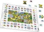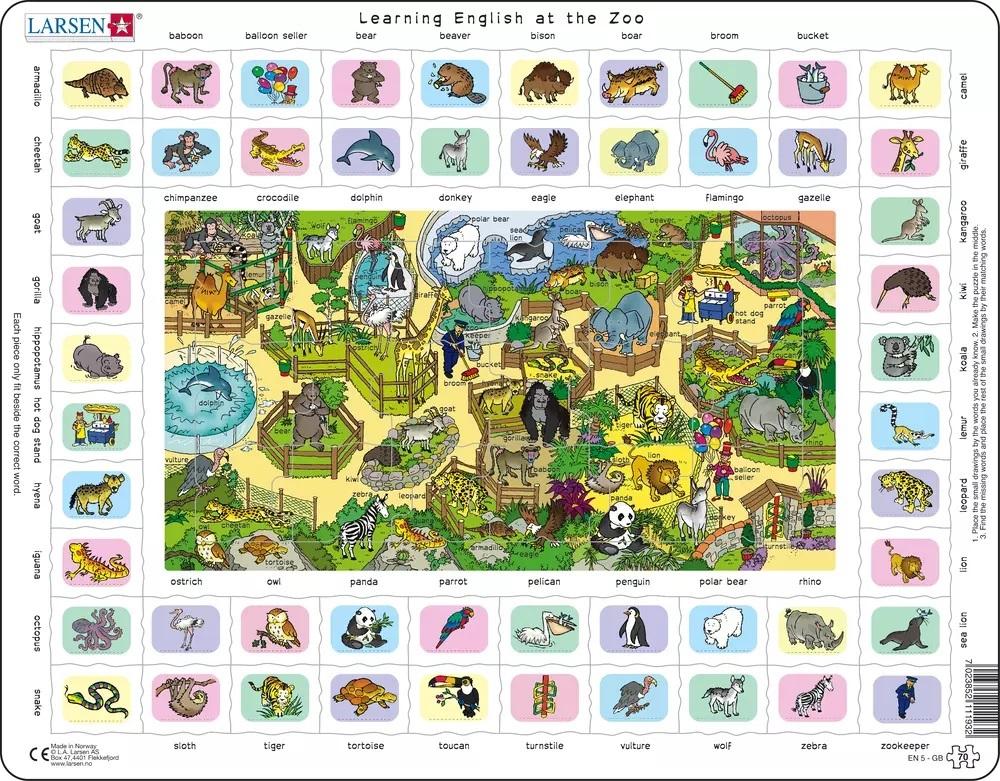 Naucz się 52 angielskich słów dzięki tej edukacyjnej układance. W środku znajduje się mała układanka z 18 elementami i stałą ramką wokół elementów. W układance znajduje się rysunek z zoo, a na nim 52 angielskie słówka dla 52 przedmiotów, które widzisz na rysunku. Te same 52 słowa znajdziesz na ramkach na zewnątrz, a tam 52 kawałki z obrazkiem. Każdy kawałek z jednym przedmiotem powinien być umieszczony przy odpowiednim słowie. Najpierw ułóż kawałki obok angielskich słów, które są Ci znane. Następnie dokończ układankę na środku, a tutaj znajdziesz angielskie słówka, których jeszcze nie poznałeś. Następnie możesz łatwo umieścić resztę kawałków w ich właściwych miejscach. Każdy kawałek pasuje tylko w odpowiednim miejscu, nawet jeśli wyglądają tak samo. Rób to czasami, a zapamiętasz słowa, których się nauczyłeś.