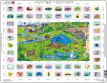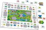 Naucz się 52 angielskich słów dzięki tej edukacyjnej układance. W środku znajduje się mała układanka z 18 elementami i stałą ramką wokół elementów. W układance znajduje się rysunek ze wsi, a na nim 52 angielskie słówka dla 52 przedmiotów, które widzisz na rysunku. Te same 52 słowa znajdziesz na ramkach na zewnątrz, a tam 52 kawałki z obrazkiem. Każdy kawałek z jednym przedmiotem powinien być umieszczony przy odpowiednim słowie. Najpierw ułóż kawałki obok angielskich słów, które są Ci znane. Następnie dokończ układankę na środku, a tutaj znajdziesz angielskie słówka, których jeszcze nie poznałeś. Następnie możesz łatwo umieścić resztę kawałków w ich właściwych miejscach. Każdy kawałek pasuje tylko w odpowiednim miejscu, nawet jeśli wyglądają tak samo. Rób to czasami, a zapamiętasz słowa, których się nauczyłeś.