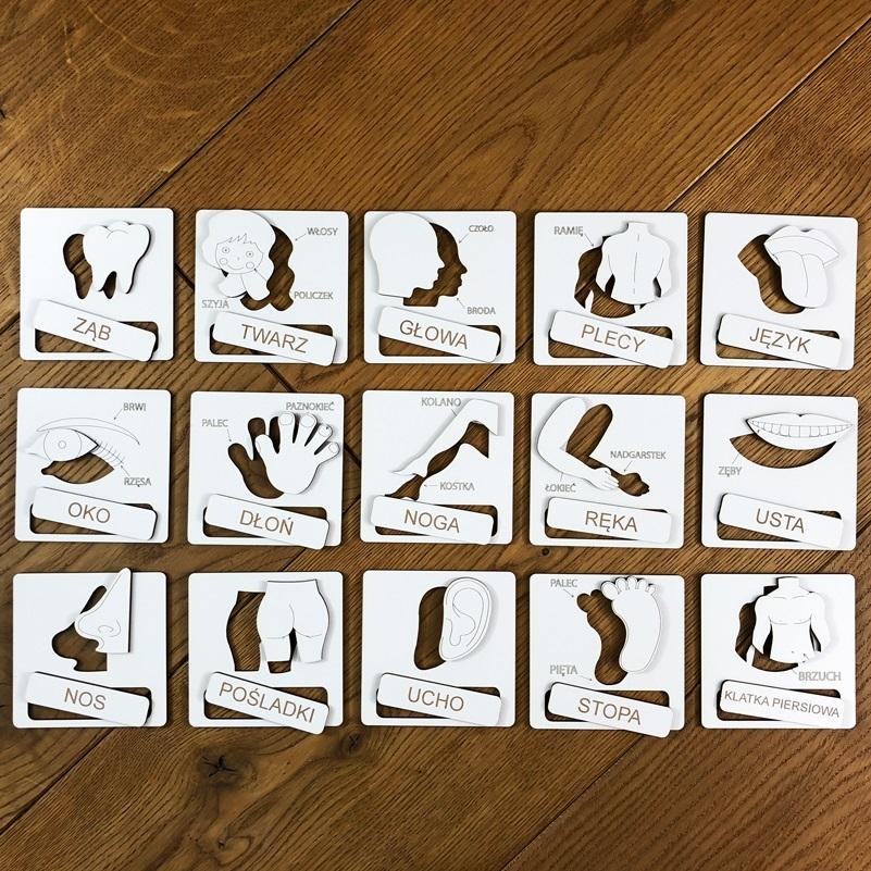 Zawiera 45 elementów (15 tabliczek z wyciętymi kształtami, 15 kształtów, 15 nazw kształtów).