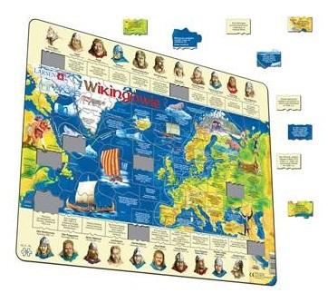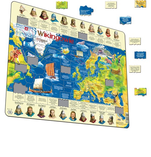 Układanka Maxi (36.5x28.5 cm) z grubej tektury ze specjalnymi kształtami, dzięki którym uczymy się nie tylko cierpliwości ale też języków, matematyki, geografii oraz wiedzy ogólnej. Popłyń statkiem przez Europę i dowiedz się wszystkiego o Wikingach. Czy będziesz walczyć w Szwecji, czy nawiążesz relacje z rdzennymi Amerykanami? Ta ilustrowana łamigłówka zawiera fakty na temat „Epoki Wikingów”. Dowiesz się o skrawku historii dziejącej się między VIII a XI wiekiem. W tym okresie Wikingowie terroryzowali i najeżdżali zarówno Europę, jak i Rosję. W górnej i dolnej części układanki znajdziesz 21 osób, które wywarły różne wpływy w tym okresie, a także zdobędziesz skrótową wiedzę o słynnych Wikingach i wydarzeniach historycznych. Produkt zachęca do zapamiętania faktów o tych postaciach historycznych. Środkowa część układanki składa się z mapy Morza Śródziemnego, Norweskiego, Północnego, Grenlandzkiego i Oceanu Atlantyckiego. Wiele elementów zawiera informacje o konkretnych wydarzeniach w określonym czasie. Kolorowe linie biegnące przez układankę pokazują trasy przemieszczania się Wikingów w poszukiwaniu nowych miejsc do osiedlenia się, zaś biały kontur wyraźnie pokazuje szlaki handlowe. Ta układanka zawiera 102 elementy i jest przeznaczona dla starszych dzieci mających ochotę zdobyć podstawową wiedzę o Epoce Wikingów. Firma Larsen od 75 lat tworzy wysokiej jakości układanki z grubej (4mm) tektury. Naszą ideą zawsze było tworzenie wysokiej jakości produktów dla dzieci, które są zarówno zabawne, jak i edukacyjne. Znajdujemy się w Flekkefjord, idyllicznym miasteczku w południowej Norwegii, w połowie drogi między Kristiansand i Stavanger. Cieszymy się że, dzięki współpracy z fińska firmą Tactic Oy, możemy oferować Państwu najwyższą jakość również w Polsce. Układanki Larsen to całe mnóstwo wzorów dostępnych w różnych stopniach trudności: edukacyjnych (dla dzieci i młodzieży szkolnej), jak i łatwych, kilku- lub kilkunastoelementowych rysunkowych przeznaczonych dla najmłodszych. Unikalny wykrojnik stanowi nie lada wyzwanie i mega frajdę dla układającego – to nie są zwykłe puzzle! Układanki Larsen odznaczają się: -nietypowymi i jedynymi w swoim rodzaju wykrojnikami, które sprawiają wielką przyjemność z układania. -produkcją w Norwegii i wysoką jakością. -staranną selekcją obrazków dla każdego wieku -edukacyjnym charakterem układanek -zlokalizowanymi wzorami na wiele rynków.