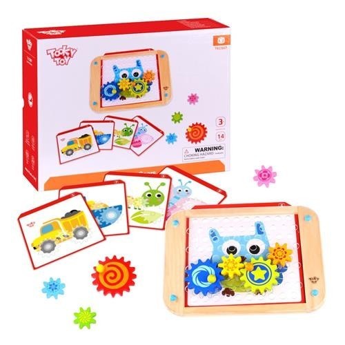 Układanka z Kółkami to zabawa motoryczna, dzięki której dziecko poznaje mechanizm kręcenia się kółek Zestaw zawiera 5 kart z rysunkami oraz 8 zębatych kółek. Zabawa polega na dopasowaniu odpowiedniej wielkości kółek do rysunku i wprawieniu ich wszystkich w ruch za pomocą obracania jednym. Każde z 8 zębatych kółeczek ma inną wielkość, kolor na obwodzie, a na środku kolorowe wzorki. Na odwrocie kółeczka są jednokolorowe. Największe koła w kolorze czerwonym, niebieskim i żółtym mają pomocnicze uchwyty. Zabawki Tooky Toy są bezpieczne. Posiadają certyfikaty ekologicznych produktów. Pozbawione ostrych krawędzi, dobrze wygładzone, pomalowane są nietoksycznymi farbami i lakierami. Wiek: 36 m+