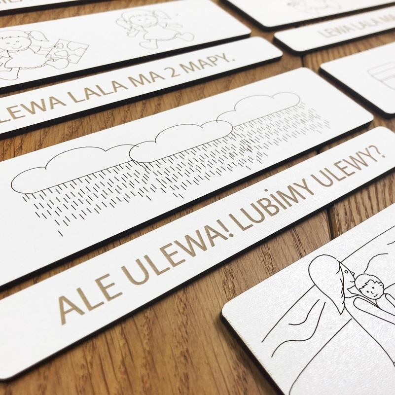 Ilość elementów: 25 z czego 12 płytek z obrazkami oraz 12 płytek ze zdaniami (utworzonymi z sylab prymarnych otwartych z wykorzystaniem paradygmatów P, M, L, B, F, W) oraz podstawą bazową,