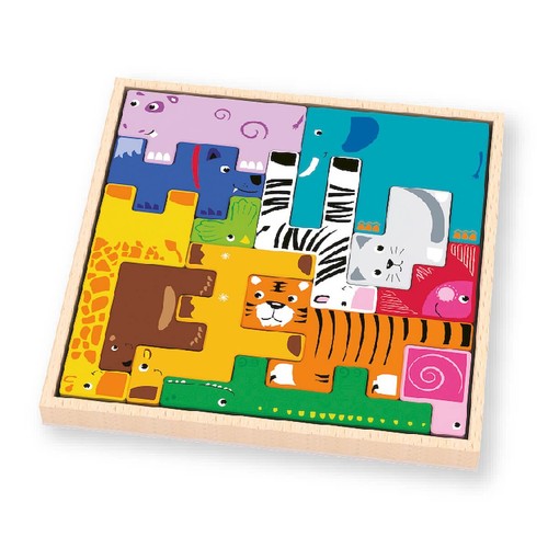 Układanka Zoo to drewniana zabawka, która rozwija sprawność rączek, koordynację wzrokowo-ruchową i wyobraźnię przestrzenną. Ponadto doskonali: inteligencję, kreatywność, zdolności manualne, wyostrza zmysł koncentracji. Układankę można ułożyć w 2D i 3D. Zestaw składa się z 14 kolorowych figurek zwierząt o różnych kształtach. Zabawa polega na układaniu ich w taki sposób, aby zbudować piramidę lub dopasować różnorodne kształty do siebie na drewnianej podstawce. Zabawa układanką Zoo daje możliwość: rozróżniania kolorów i kształtów, rozwoju logicznego myślenia, rozwiązywania problemów. Wiek: od 18 do 36 m