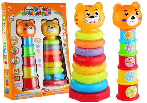 Tygrysek i miś - układanki edukacyjne Zabawki edukacyjne są doskonałym prezentem dla maluszka. Prezentowany przez nas zestaw wygląda bardzo uroczo — składa się z różnych kolorów i kształtów, a ponadto rewelacyjnie wpływa na rozwój dziecka. Zabawki te dają maluchowi wiele możliwości na zabawę, podczas której zwiększają jego zdolności obserwacji i koordynacji wzrokowo-ruchowej, rozwijając również kreatywność i logiczne myślenie. Zestaw składa się z 16 różnych elementów. Nie zajmuje dużo miejsca — wieżyczka może być złożona od najmniejszego kubeczka do największego, co zaoszczędzi bardzo dużo powierzchni. Wieża z kubeczkami zwieńczona jest pomarańczową główką misia. Składa się ona z pięciu kubeczków o różnych kolorach i kształtach. Każdy z nich oznaczony jest naklejką zawierającą numerek odpowiadający wielkości kubeczka, a także główki zwierzątek. W górnej części każdego elementu znajduje się obrazek symbolizujący dane zwierzę, na przykład kurę, psa, owieczkę czy konika. Stojaczek-tygrysek umieszczony jest na chwiejnej, bujającej się podstawce. Po delikatnym wprawieniu go w ruch zabawka zachowuje się jak Wańka Stańka, kołysząc się na boki. Podstawka połączona jest z prostym drążkiem, na którym układa się kolorowe podkówki. Każda z nich posiada inny rozmiar, a także kolor i fakturę, co rewelacyjnie wpłynie na rozwój dziecka, stymulując jego zmysł dotyku. Można bawić się nimi również na inny sposób — łącząc je ze sobą, tworząc długi łańcuszek z zabawki. Kolorowe kubeczki ułatwią dziecku naukę numerków i nazw zwierzątek, natomiast podkówki pokażą maluszkowi różne kształty i faktury. Zabawki edukacyjne dla maluszków powyżej 3. miesiąca życia posiadają certyfikat CE, ich produkcja jest zgodna z normą EN 71. Wszelkie elementy zostały wykonane z bezpiecznego, atestowanego tworzywa, jakim jest plastik. Ich konstrukcja jest lekka i opływowa, co eliminuje jakiekolwiek ryzyko płynące z zabawy. Kolorowy zestaw do sortowania zapakowany jest w kartonowe, pomarańczowe pudełeczko z dwoma przeźroczystymi witrynkami. Wymiary elementów zabawki: - tygrysek z podstawką: 30 cm x 12 cm, - główka tygryska: 8,5 cm x 7,5 cm, - najmniejsza podkówka: 8 cm, - największa podkówka: 11,5 cm, - miś z podstawką: 30 cm x 7,5 cm, - główka misia: 8 cm x 8,5 cm, - najmniejszy kubeczek: 5,5 cm x 4 cm, - największy kubeczek: 7 cm x 5,5 cm. Wymiary opakowania: - 39 cm x 29,5 cm x 8,5 cm.