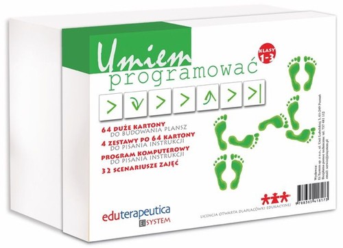 To unikalny zestaw scenariuszy lekcji i różnorodnych pomocy dydaktycznych pozwalających wprowadzić dzieci z klas 1-3 szkoły podstawowej w świat programowania. Zestaw nie wymaga korzystania z komputera ani tabletu, niemniej tam, gdzie to jest technicznie możliwe, takie wykorzystanie wspiera. Scenariusze i materiały zostały opracowane w sposób ułatwiający wykorzystanie przez każdego z nauczycieli nauczania początkowego i nie wymagają specjalnego przygotowania informatycznego. Wszystko, czego będzie nam potrzeba, to tworzące się na tym etapie rozwoju dziecka podstawy myślenia operacyjnego bazujące na odpowiednich do wieku przykładach konkretnych. Zawartość pudełka: 32 wielkowymiarowe kartony kwadratowe i 32 kartony prostokątne do budowania plansz, map i labiryntów na podłodze, 4 zestawy po 64 kartony do pisania instrukcji, program komputerowy do budowania plansz, pisania i wykonywania instrukcji, 32 scenariusze zabaw i zajęć, 24 wzory kart pracy do kopiowania, dyplomy, poradnik metodyczny.