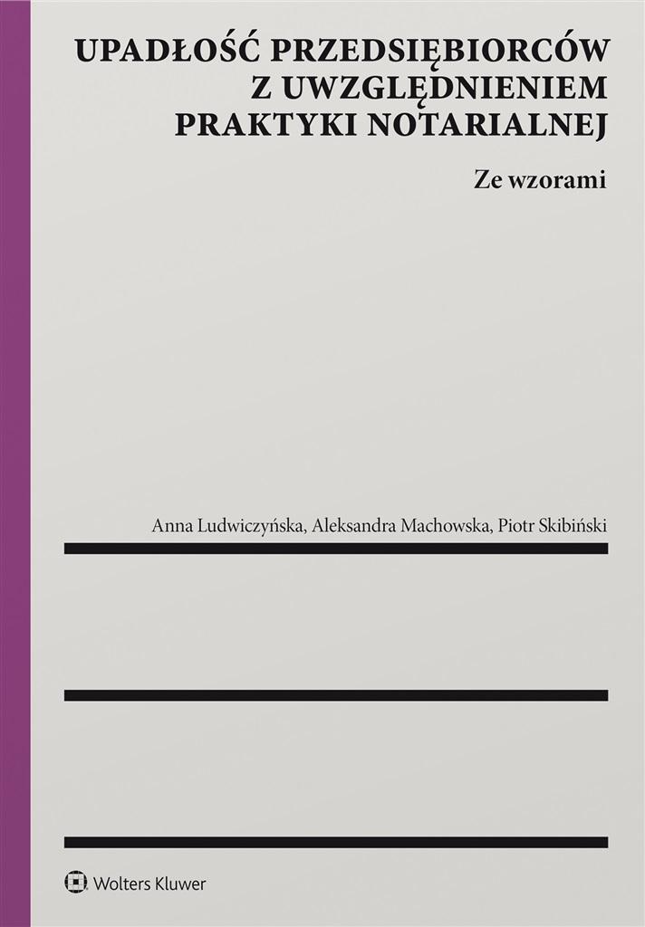 Książka stanowi unikatową pozycję na rynku wydawniczym, uwzględniającą specyfikę postępowania upadłościowego przedsiębiorców, zarówno osób prawnych (m.in. spółek), jak i osób fizycznych (prowadzących indywidualną działalność gospodarczą, wspólników spółek osobowych itp.). Publikacja zawiera omówienie problematyki z zakresu: - prawa spółek handlowych, w tym zasady reprezentacji, zdolności prawnej, skutki postępowania upadłościowego dla bytu spółek, - postępowań upadłościowych w zbiegu z innymi postępowaniami na wypadek niewypłacalności przedsiębiorcy, - wybranych zagadnień z zakresu problematyki upadłościowo-rejestrowej na tle przepisów ustawy Prawo upadłościowe oraz ustawy o Krajowym Rejestrze Sądowym, - postępowań depozytowych w związku z prowadzonym postępowaniem upadłościowym. Dużo uwagi poświęcono zagadnieniom upadłości w praktyce notarialnej, w tym: - wpływowi ogłoszenia upadłości na działania notariusza, - nabyciu spadku przez upadłego, - zasadom sprzedaży upadłościowej. Ponadto autorzy omówili zagadnienia dotyczące zakresu orzekania o zakazie prowadzenia działalności gospodarczej, które należy do jednego z najbardziej skomplikowanych kwestii związanych z postępowaniami upadłościowymi. Dodatkowo przybliżono kwestię międzynarodowego, a w szczególności - europejskiego transgranicznego postępowania upadłościowego oraz funkcjonowania Krajowego Rejestru Zadłużonych. Opracowanie zawiera praktyczne wzory (w tym aktów notarialnych) ułatwiające zredagowanie pism procesowych lub orzeczeń
