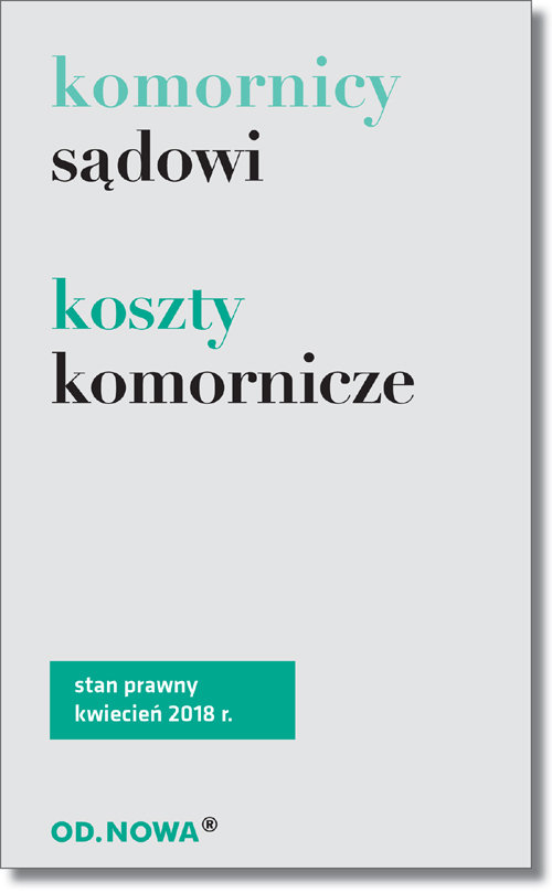 „Komornicy sądowi, koszty komornicze” broszura – zawiera jednolity tekst ustawy z dnia 22 marca 2018 r. o komornikach sądowych oraz ustawę z dnia 28 lutego 2018 r. o kosztach komorniczych. Zaletą książki jest jej praktyczny, poręczny format, przejrzysty układ graficzny i niska cena. Stan prawny: 1 stycznia 2019 r. Publikacja zawiera obszerny skorowidz. Publikacja wskaże Ci informacje z zakresu: – powoływanie i odwoływanie komorników; prawa i obowiązki komorników; zastępstwo komornika; likwidacja kancelarii; aplikanci komorniczy; egzamin wstępny; aplikacja; egzamin komorniczy; asesorzy; koszty działalności egzekucyjnej komornika i zasady prowadzenia kancelarii; nadzór nad komornikami; samorząd komorniczy; odpowiedzialność dyscyplinarna – wydatki; opłaty komornicze; opłaty egzekucyjne w sprawach o egzekucję świadczeń pieniężnych; opłaty egzekucyjne w sprawach o egzekucję świadczeń niepieniężnych; pozostałe opłaty; zwolnienie od kosztów komorniczych i obniżenie opłaty Szczególnie pomocna dla: – praktyków – studentów – osób ceniących sobie poręczny format, niewielkie gabaryty książki oraz przystępną cenę