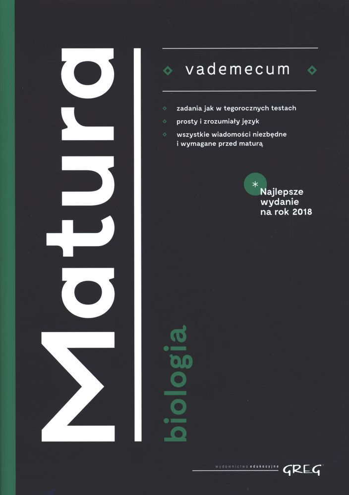 Vademecum Matura - biologia Wydawnictwa GREG to książka zawierająca całość materiału potrzebnego do przygotowań do matury w jej aktualnie obowiązującej formule. Jest zgodna z najnowszą podstawą programową, uwzględnia też treści z klasy I, które dodatkowo oznaczono graficznie. Książka prezentuje wyłącznie ważne i potrzebne informacje, bez faktów ponadprogramowych, a pracę z nią ułatwia przystępny, zrozumiały język. Wprowadzono liczne tabelki, wykresy, wyliczenia, diagramy, rysunki, zdjęcia. Najważniejsze definicje wyróżniono wyraźnymi ramkami. Ważnym uzupełnieniem jest indeks pojęć, ułatwiający poruszanie się po książce. Oznaczeniami graficznymi wyróżniono tematy i zagadnienia, które pojawiły się na maturze w ostatnich latach, oraz dodano oryginalny arkusz maturalny. Vademecum Matura - biologia Wydawnictwa GREG jest doskonałą pomocą zarówno dla osób, które podjęły decyzję o wyborze biologii jako przedmiotu maturalnego, jak dla uczniów pierwszej klasy liceum, którzy chcą skutecznie przygotować się do klasówki lub odpowiedzi albo powtórzyć materiał. Książka w nowoczesnej i kolorowej szacie graficznej! Dołączono tasiemki ułatwiające zaznaczenie potrzebnych fragmentów oraz komplet zakładek z nadrukowanymi najbardziej potrzebnymi wiadomościami. Całość w funkcjonalnej i estetycznej oprawie zintegrowanej, wraz z obwolutą. Wielką zaletą naszych repetytoriów jest bardzo trafne przewidywanie pytań na tegorocznym egzaminie. W każdej publikacji uwzględniliśmy tegoroczne przewidywania oraz pewniaki na test i egzamin. Serdecznie polecamy!
