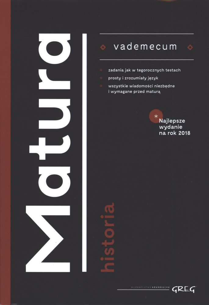 Vademecum Matura - historia Wydawnictwa GREG zawiera całość materiału potrzebnego do przygotowania się do matury w jej obecnie obowiązującej formule. Jest zgodne z najnowszą podstawą programową, a treści obejmujące materiał z klasy I dodatkowo oznaczono graficznie. Książka ta nie została przeładowana niepotrzebnymi informacjami, a zawarte w niej treści podane są przystępnym, zrozumiałym językiem. Tam, gdzie było to możliwe, treść ujęto w ułatwiające naukę formy tabel, diagramów, wyliczeń. Naukę ułatwiają liczne mapy, rysunki i zdjęcia. Najważniejsze definicje dodatkowo wyróżniono wyraźnymi ramkami. Ważnym uzupełnieniem jest indeks pojęć. W tekście wskazano też za pomocą oznaczeń graficznych tematy i zagadnienia, które w ostatnich latach pojawiły się na maturze, oraz dołączono oryginalny arkusz maturalny. Vademecum Matura - historia Wydawnictwa GREG stanowi doskonałą pomoc zarówno dla osób decydujących się wybrać historię jako przedmiot maturalny, jak dla uczniów pierwszej klasy liceum, którzy chcą szybko powtórzyć materiał lub skutecznie przygotować się do klasówki czy odpowiedzi. Książka w nowoczesnej i kolorowej szacie graficznej! Dołączono tasiemki ułatwiające zaznaczenie potrzebnych fragmentów oraz komplet zakładek z nadrukowanymi najbardziej potrzebnymi wiadomościami. Całość w funkcjonalnej i estetycznej oprawie zintegrowanej, wraz z obwolutą. Wielką zaletą naszych repetytoriów jest bardzo trafne przewidywanie pytań na tegorocznym egzaminie. W każdej publikacji uwzględniliśmy tegoroczne przewidywania oraz pewniaki na test i egzamin. Serdecznie polecamy!