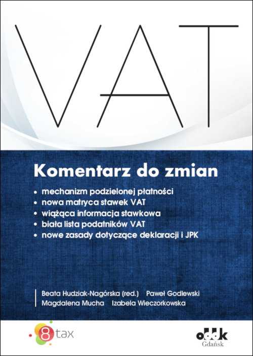 Komentarz do najważniejszych zmian w ustawie o podatku od towarów i usług, wprowadzonych: - ustawą z dnia 12 kwietnia 2019 r. o zmianie ustawy o podatku od towarów i usług oraz niektórych innych ustaw (Dz.U. poz. 1018), - ustawą z dnia 4 lipca 2019 r. o zmianie ustawy o podatku od towarów i usług oraz niektórych innych ustaw (Dz.U. poz. 1520), - ustawą z dnia 31 lipca 2019 r. o zmianie niektórych ustaw w celu ograniczenia obciążeń regulacyjnych (Dz.U. poz. 1495) oraz - ustawą z dnia 9 sierpnia 2019 r. o zmianie ustawy o podatku od towarów i usług oraz niektórych innych ustaw (Dz.U. poz. 1751). Autorzy, doradcy podatkowi z wieloletnim doświadczeniem, w przejrzysty sposób omawiają zmiany dotyczące m.in.: - mechanizmu podzielonej płatności, - nowej matrycy stawek VAT, - wiążącej informacji stawkowej, - białej listy podatników VAT, - ograniczeń w zwolnieniu podmiotowym, - nowych zasad wystawiania faktur do paragonów, - doprecyzowania warunków wykreślenia z rejestru VAT podatników nieskładających deklaracji, - uproszczeń korekty VAT naliczonego w przypadku powrotu do zwolnienia, - nowych zasad dotyczących deklaracji i JPK, - nowych sankcji za błędy w ewidencji. Dodatkowo w książce zawarto wiele praktycznych przykładów, a także ujednolicony tekst ustawy o podatku od towarów i usług z wyróżnieniem zmian obowiązujących od 1, 23 i 29 listopada 2019 r. oraz 1 stycznia, 1 kwietnia i 1 lipca 2020 r.