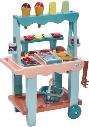 Stragan cukiernia z 26 akcesoriami w tym: imitacje lodów, gofrów, słodkich przekąsek, kubek, kasa oraz koszyk na zakupy. Do produkcji serii Vert Azur wykorzystywane są odpady po produkcji zabawek Ecoiffier. Wyprodukowane we Francji. Wymiary: 44,5 x 30 x 61,5 cm, 18 m+