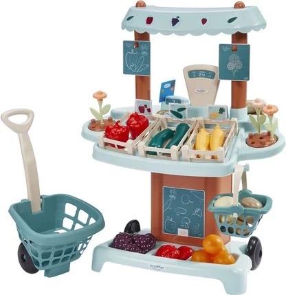 Stragan z 41 akcesoriami w tym imitacje owoców, warzyw, kwiatów. W zestawie znajduje się dodatkowo waga, oraz mały koszyk i wózek na zakupy z długą rączką. Do produkcji serii Vert Azur wykorzystywane są odpady po produkcji zabawek Ecoiffier. Wyprodukowane we Francji. Wymiary: 54,5 x 40 x 69 cm, 18 m+