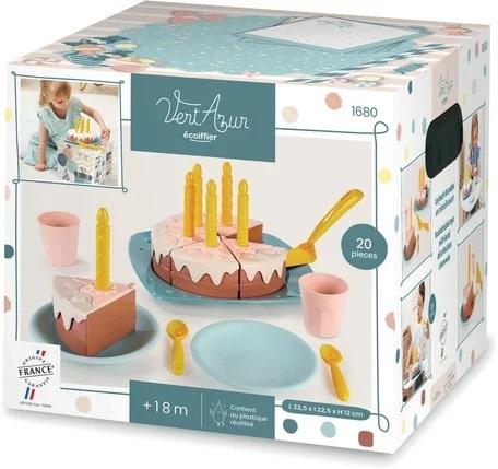 Zestaw składający się z 20 akcesoriów w tym: kawałki tortu ze świeczkami, talerzyki, kubeczki, łopatka łyżeczki. Do produkcji serii Vert Azur wykorzystywane są odpady po produkcji zabawek Ecoiffier. Wyprodukowane we Francji. Wymiary: 22,5 x 22,5 x 12 cm, 18m+