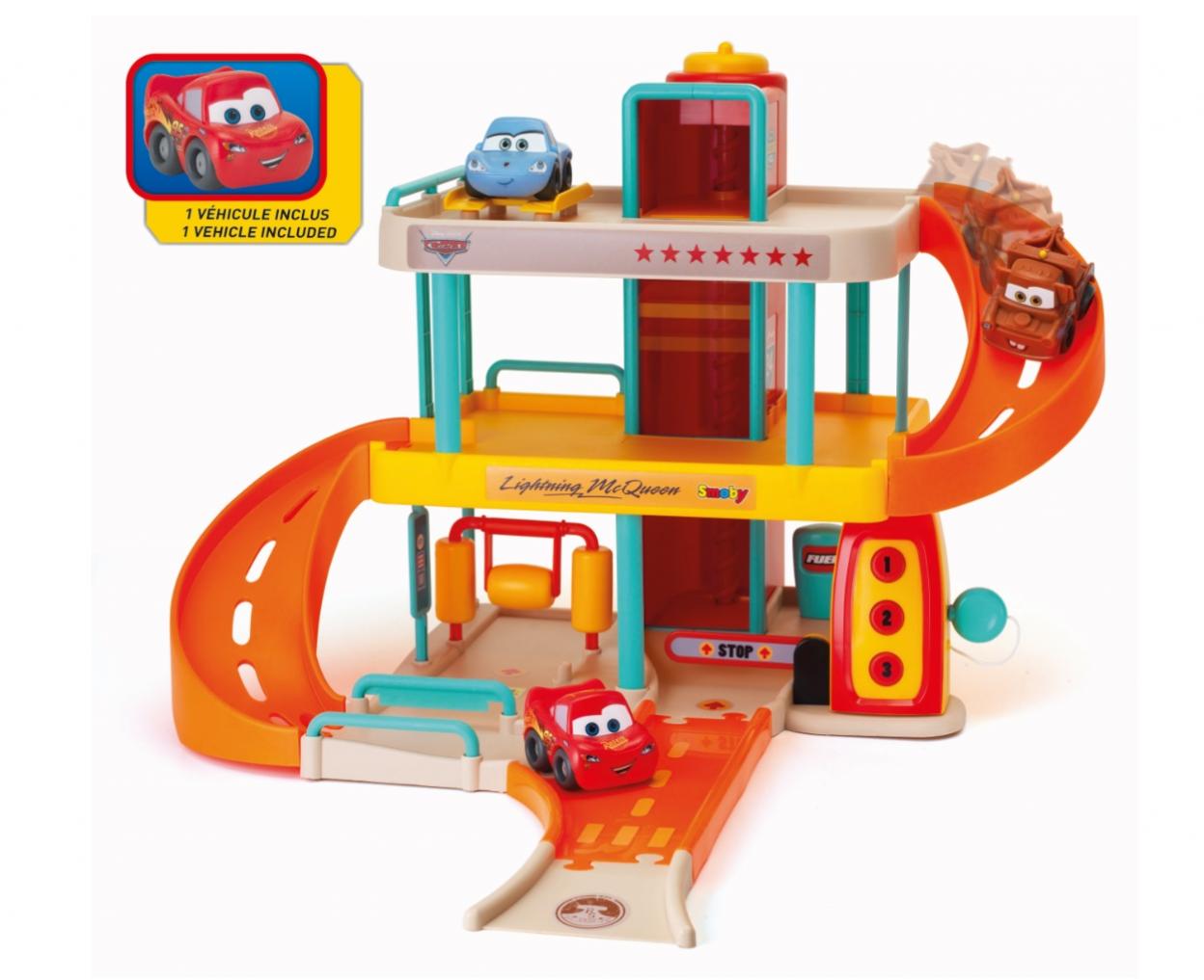Elektroniczny duży garaż z 3 poziomami do zabawy m.in. myjnia samochodowa, winda, rampa, elektroniczna brama, dystrybutor oraz 1 pojazd Zygzaka McQueena. Dziecko może otwierać i zamykać szlaban za pomocą specjalnego klucza.