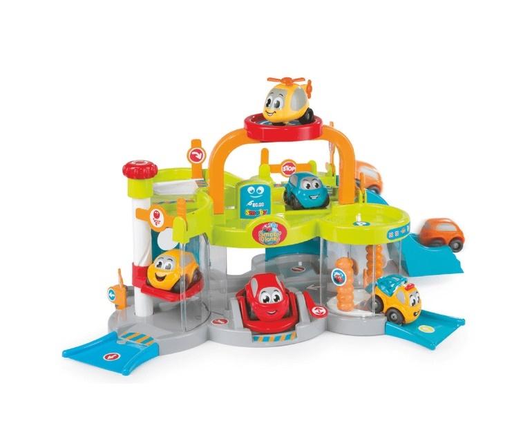 Garaż posiadający wiele ciekawych funkcji stworzonych z myślą o małych brzdącach: fantastyczna winda, myjnia samochodowa z obracającymi się myjkami, lądowisko dla helikoptera, zjeżdzalnia i wiele innych atrakcji umilających dzieciom zabawę. W zestawie znajduje się samochód i helikopter.