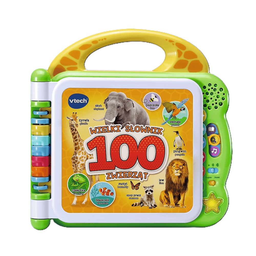 Wielki Słownik Zwierząt to obowiązkowa lektura każdego malucha! Interaktywna książeczka pomaga poznać 100 zwierząt w języku polskim i angielskim. Zawiera 3 warianty zabawy - słownictwo, odkrywanie i odgłosy. Dodatkowo 2 zabawne piosenki, 12 edukacyjnych, bardzo czułych na dotyk, laminowanych stron, które uczą nazw zwierząt. Wygodny uchwyt dostosowany do małych rączek pozwala na zabranie Słownika w dowolne miejsce