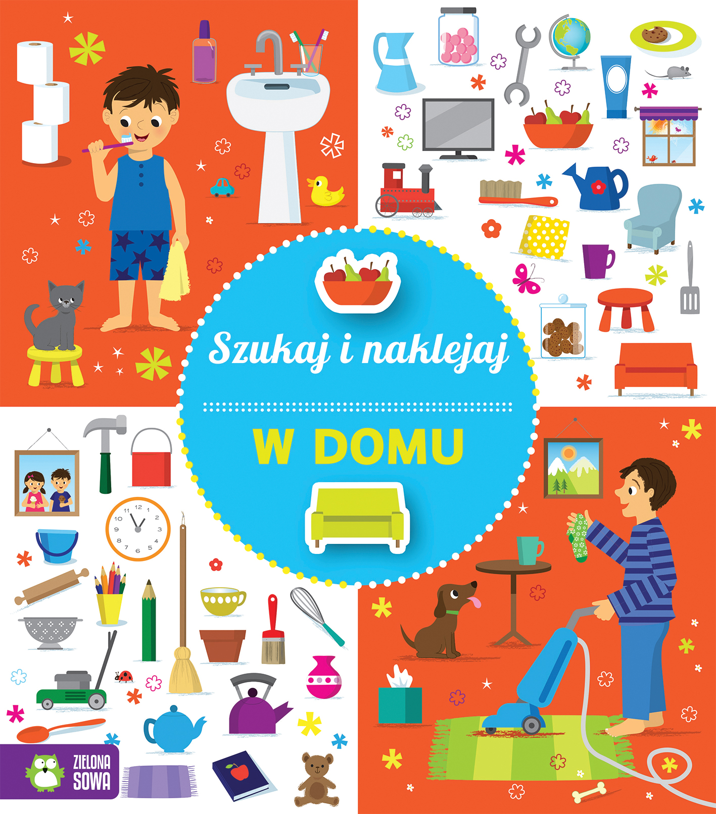 Filiżanka, gumowa kaczuszka, globus, śrubokręt i wiele innych rzeczy z kolejnych domowych pomieszczeń sprawdź, czy znajdziesz wszystkie przedmioty na obrazku! Książeczki z kolorowymi ilustracjami i naklejkami. Dziecko poznaje pojazdy, zwierzęta, życie na wsi i przeróżne sprzęty, które można zobaczyć w domu. Na każdej stronie jest mnóstwo elementów do odszukania na dużej ilustracji. Dziecko odpowiada na zamieszczone obok niej pytania i przykleja naklejki we właściwych miejscach.