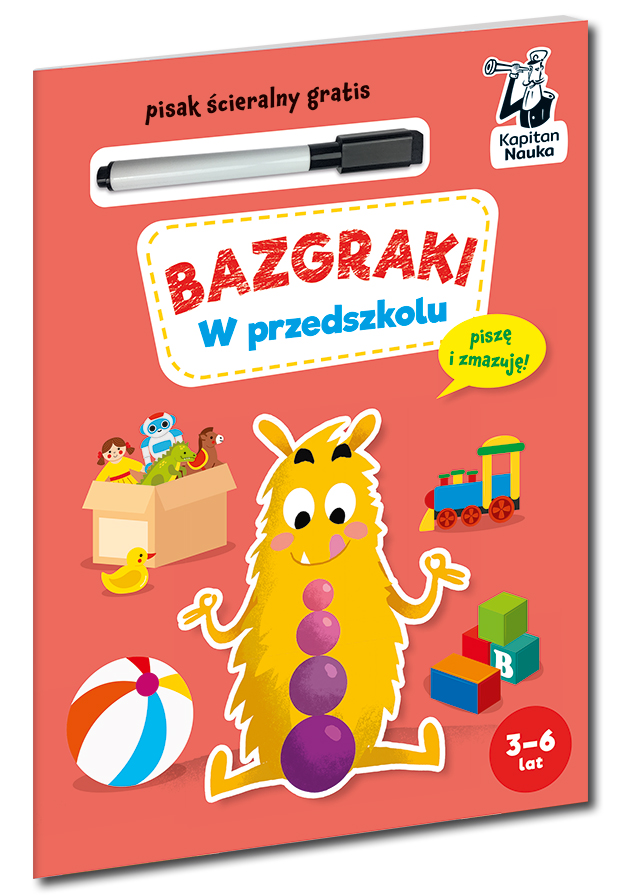 Bazgraki idą do przedszkola i rozwiązują łamigłówki! W tym zeszycie znajdziesz różnorodne i angażujące zadania, które gwarantują długą zabawę! Łamigłówki wciągną cię w świat Bazgraków i ich szalonych pomysłów. Bazgraki bawią się w przedszkolu. Dołącz do nich! Który z Bazgraków będzie świętował urodziny? Jakie zabawki najbardziej lubi Gryzka? Kto założy kostium na bal przebierańców? Co Ptyś zje na podwieczorek? Do zeszytu dołączony jest pisak ścieralny, dzięki któremu można rozwiązywać zadania bez końca! Kapitan Nauka to marka, która wspiera rozwój i edukację dziecka przez kreatywną zabawę. Nasze produkty dostosowane są do potrzeb maluchów, przedszkolaków oraz uczniów i rozwijają kluczowe umiejętności m.in. nauki mowy, czytania, liczenia czy mnożenia. Są świetną alternatywą dla smartfona czy komputera, a czas spędzony przy wspólnych rozgrywkach, w gronie rodziny lub rówieśników wzmacnia więzi i umiejętności komunikacyjne. Nad zawartością merytoryczną czuwają eksperci: nauczyciele, pedagodzy, psycholodzy i terapeuci.