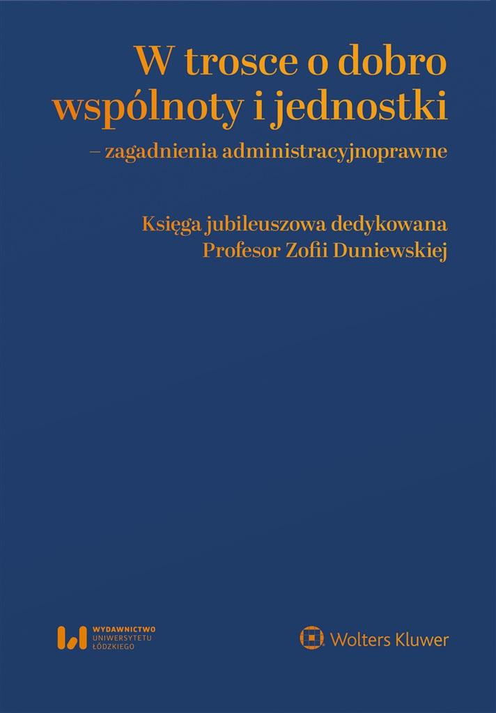 Księga powstała z okazji jubileuszu 70-lecia Profesor Zofii Duniewskiej, zbiegającego się z jej 45-letnią pracą w Katedrze Prawa Administracyjnego i Nauki Administracji Wydziału Prawa i Administracji Uniwersytetu Łódzkiego. Jubilatka należy do grona znanych polskich administratywistów. Jej bogaty dorobek naukowy obejmuje ponad 150 opracowań, które oprócz walorów naukowych znamionuje także duża doniosłość praktyczna. Dzieło zawiera ponad 30 artykułów poświęconych zagadnieniom administracyjnoprawnym ukierunkowanym na potrzeby jednostek i ich wspólnot, czyli tematom bliskim Jubilatce. Tytuł księgi - W trosce o dobro wspólnoty i jednostki - odzwierciedla charakter i zainteresowania badawcze Pani Profesor, która od lat koncentruje się na pozycji administracyjnoprawnej podmiotów administrowanych, przy czym centralne miejsce przypisuje człowiekowi oraz tworzonym przez ludzi społecznościom. Pełna oddania troska o ich dobrostan, wiara w humanistyczną misję prawa administracyjnego i proobywatelskie podejście do podejmowanych problemów są widoczne we wszystkich obszarach Jej twórczości zarówno badawczo-naukowej, jak i dydaktycznej. W podziękowaniu autorzy pragną wyrazić uznanie dla dokonań Pani Profesor oraz wdzięczność za możliwość bycia Jej przyjaciółmi i współpracownikami.
