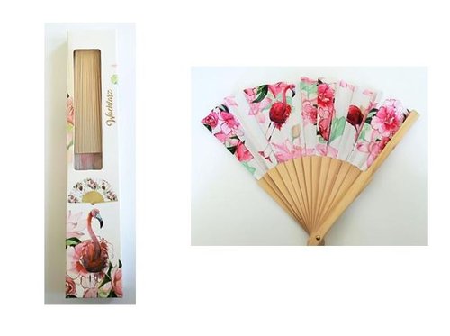 * materiałowy wachlarz z grafiką flamingów * idealny na ciepłe dni * z drewnianą rączką * doskonały pomysł na prezent dla każdej kobiety