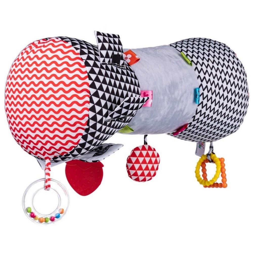 Milutki wałek do wsparcia dziecka leżącego na brzuszku zadba o wygodę malucha, zapewniając mu moc atrakcji! Na małego miłośnika zabawy czeka tu piszczałka, gryzaczki, grzechotka oraz szeleszczące łatki z podobiznami zwierzątek! Wałek wykonany został ze zróżnicowanych materiałów ozdobionych kontrastowymi wzorami, które stymulują zmysły wzroku i dotyku dziecka.