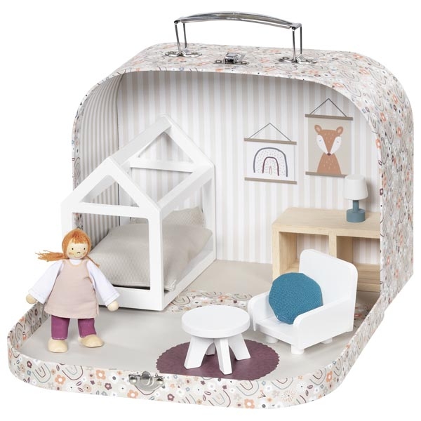 To wyjątkowy, przenośny apartament dla lalek, który po otwarciu zamienia się w urocze, w pełni umeblowane wnętrze, zapraszające do kreatywnej i angażującej zabawy. Wystarczy rozłożyć walizkę, by rozpocząć niezwykłą przygodę w świecie wyobraźni.