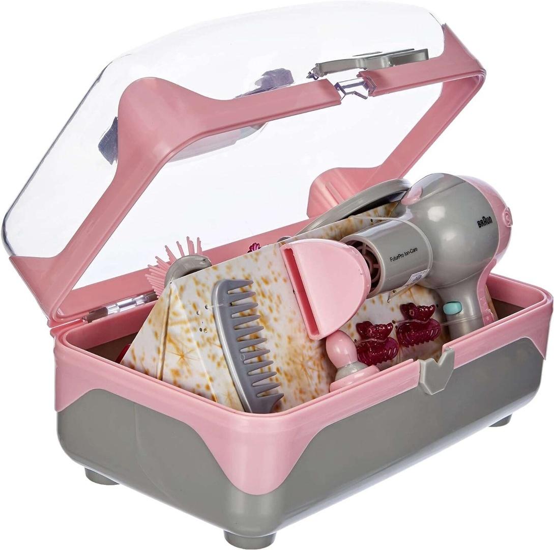 KL 5862 Skrzynka fryzjerska Braun Zestaw fryzjerski zamknięty jest w plastikowym kuferku z ruchomą rączką. Kuferek jest w kolorze szarym w połączeniu z różem, a jego górna część jest transparentna, dzięki czemu widać jego zawartość. Ponadto kuferek posiada plastikowe szarek zapięcie z wytłoczonym logo marki Klein oraz cztery nóżki, na których można go postawić podczas zabawy. Zabawka ta wykonana jest z tworzywa bardzo dobrej jakości. Wszystkie urządzenia wykonane są identycznie jak prawdziwe (dla dorosłych) z serii Braun. Uruchomienie suszarki następuje po wciśnięciu przycisku, który znajduje się na rączce, a sama suszarka emituje cichy dźwięk działania silniczka oraz dmucha chłodnym strumieniem powietrza. Suszarka wyposażona jest w końcówkę do prostowania włosów. Jest to komplet doskonały dla wymagającej, profesjonalnej, małej fryzjerki. W zestawie znajduje się łącznie aż 15 elementów, w tym suszarka do włosów (do właściwego działania niezbędne są baterie, nie dołączone w zestawie), szczotka do włosów, grzebień, obracane/stojące lusterko, buteleczka perfum imitacja, szminka imitacja, spinki do włosów - 8 szt., gumka do włosów. Niemiecka firma Klein specjalizuje się w tworzeniu zabawek na licencji. Małe, plastikowe zabawki wyglądają niczym prawdziwe, elektroniczne urządzenia codziennego użytku. Specyfikacja: Produkt jest zabawką Zabawka przeznaczona dla dzieci powyżej 3 roku życia Waga : 0,9 kg Wymiary opakowania : 28x16x17 cm Wymagane baterie : 1 x AA Ilość w opakowaniu zbiorczym : 6 Kraj pochodzenia : Chiny Kolekcja akcesoriów fryzjerskich firmy Klein skierowana jest przede wszystkim do dziewczynek. Oferuje ona szeroką gamę produktów doskonale uzupełniających się na wzajem. Podczas zabawy dzieci mogą naśladować zaobserwowane w świecie dorosłych sytuacje. Urządzenia do stylizacji fryzur wyposażone są w funkcje imitujące pracę prawdziwej suszarki, czy prostownicy. Wykonane są one z niezwykłą starannością, dzięki czemu, dziewczynki mogą układać fryzury nie tylko lalkom, ale także mamom, czy koleżankom. Suszarka dmucha powietrzem, ale nie nagrzewa się. Grzebień, szczotka, spinki do włosów mają zaokrąglone końcówki, którymi nie można się ukłuć ani skaleczyć. Wszystkie elementy są bardzo wysokiej jakości, są także bardzo ładnie wykonane, a wielkością dostosowane do dziecięcych rąk. Wszystkie zestawy zaprojektowane są w pięknej dziewczęcej kolorystyce i zachęcają do kreatywnej zabawy dziewczynki w różnym wieku. Marka Klein znana jest na świecie z produktów wykonanych z dbałością o szczegóły, z najlepszej jakości materiałów oraz atrakcyjnego wzornictwa. Zabawki tej marki idealnie trafiają w gusta małych i większych użytkowników. Artykuły oznaczone marką Klein gwarantują świetną zabawę oraz odznaczają się długą żywotnością. W serii KLEIN akcesoria fryzjerskie dostępne również: KL 5236 Głowa do stylizacji i czesania średnia KL 5240 Głowa do stylizacji i czesania duża KL 5273 Zestaw fryzjerski w walizce Princess Coralie KL 5293 Zestaw do stylizacji włosów w walizce Princess Coralie KL 5392 Głowa do czesania i stylizacji duża NEW KL 5549 Zestaw kosmetyków Princess Coralie KL 5801 Szafa-garderoba Barbie KL 5850 Suszarka Braun z dyfuzorem i szczotką KL 5855 Walizka fryzjerska Braun KL 5867 Suszarka Braun z dodatkami KL 5873 Zestaw fryzjerski Braun