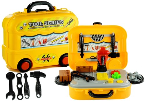 Żółta walizka dla majsterkowicza 3 w 1 Narzędzia przeznaczone dla dzieci to zabawki, które w rewelacyjny sposób rozwijają orientację przestrzenną, uczą logicznego myślenia, a także pobudzają kreatywność i wyobraźnię. Sprawiają, że chłopiec może poczuć się jak tata lub dziadek — w domu uchodzący za złotą rączkę. Zestaw takich zabawek pozwoli również na wspólną pracę w garażu lub ogródku, gdzie każdy będzie mógł używać dostosowanych do siebie narzędzi. W zestawie znajduje się między innymi: - blacik i podpórki, - piła tarczowa, - śrubokręt, - młotek, - klucz nastawny, - śrubki, - nakrętki, - imitacja drewna, - szelki do plecaka, - zestaw ozdobnych naklejek. Prezentowany zestaw spodoba się każdemu chłopcu! Żółta walizeczka posiada czarne detale — rączkę, ułatwiającą przenoszenie, a także ruchome kółeczka. Jednak to nie wszystko — by dziecko mogło zabrać ją ze sobą na plac zabaw lub do kolegi, wystarczy doczepić do specjalnych uchwytów regulowane szelki, które dołączono do zestawu. Zabawka odznacza się nie tylko uniwersalnością i świetnym designem — składa się z 24 elementów, które zapewniają fantastyczną zabawę. Każde z narzędzi pomimo realnego wyglądu posiada bezpieczną, opływową formę, gwarantującą komfort i lekkość użytkowania. Rozmiar zabawkowych narzędzi dostosowany jest do rączek dzieci, dzięki czemu zabawa będzie ogromną przyjemnością. Jak sprawić, by walizeczka zamieniła się w stolik do majsterkowania? Wystarczy ją rozłożyć, odwrócić blacik i dołączyć podpórki i wieszaczki na narzędzia. By spersonalizować swój zestaw, chłopiec może użyć naklejek dołączonych do zabawki, i ozdobić elementy według własnego, indywidualnego pomysłu. Kolorystyka zabawki z pewnością spodoba się każdemu dziecku — czarne narzędzia połączone z czerwonymi i żółtymi detalami prezentują się doskonale. Zestaw dla małego majsterkowicza posiada certyfikat CE, jego produkcja jest zgodna z normą EN 71. Wszelkie elementy wchodzące w skład zestawu wykonano z atestowanego, solidnego tworzywa, które gwarantuje komfort użytkowania i bezpieczeństwo. Zestaw przeznaczony jest dla wszystkich chłopców powyżej 3. roku życia, zapakowany jest w kartonową, kolorową przepaskę. Wymiary wybranych elementów: - walizka: 25 cm x 20 cm, - piła: 15 cm x 13 cm, - młotek: 11 cm x 6 cm, - śruba: 4,5 cm x 2 cm.