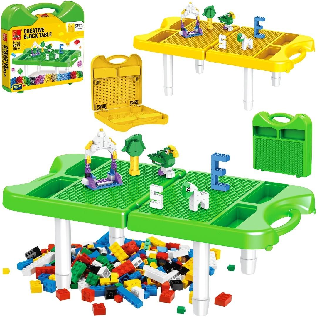 - Walizka/Schowek: Stolik składa się do formy poręcznej walizki z uchwytem (zielona obudowa), co ułatwia przenoszenie i przechowywanie klocków, zapewniając porządek.