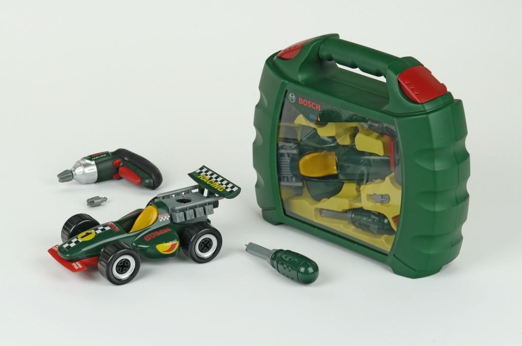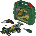 Walizka z autem i wkrętarką marki Klein pochodzi z serii zabawek Bosch mini powstałej na licencji firmy Bosch, dlatego też wkrętarka wchodząca w jej skład są wierną kopią faktycznie istniejącego narzędzia tej marki. Zestaw zapakowany jest w ciemno-zieloną plastikową walizkę z przezroczystym przednim panelem, przez który widać jej zawartość. Walizka posiada dwa czerwone zatrzaski zamieszczonym po obu stronach wyprofilowanej rączki, zabezpieczając tym samym narzędzia i elementy auta tego kompletu przed przypadkowym wypadnięciem podczas transportu. Zestaw zawiera elementy konstrukcyjne auta w tym podwozie i nadwozie auta wyścigowego w kolorze ciemno-zielonym, cztery duże, plastikowe koła do zamontowania w aucie, zielony i czerwony spoiler, sześć czarnych śrub, a także zestaw naklejek do ozdobienia auta. Bardzo ważnym elementem tego zestawu ułatwiającym skręcenie i zabawę autem jest bezprzewodowa wkrętarka na baterie (KL 8602) Bosch Ixiolino z jednym dodatkowo wymiennym bitem. Wkrętarka jest solidnie wykonana z dużą dbałością o szczegóły, przez co wiernie naśladuje prawdziwe urządzenie. Wkrętarka jak prawdziwa ma wygodny uchwyt z gumową powierzchnią ułatwiającą utrzymanie zabawki w dziecięcych dłoniach, ma możliwość przełączenia za pomocą czerwonego przesuwaka obrotu końcówki w prawo i w lewo. W zestawie jest także śrubokręt z zieloną rączką, który pozwala na manualne skręcenie auta tego zestawu. Ten wspaniały zestaw zachwyci każdego małego chłopca, który dzięki niemu będzie mógł nie tylko wcielić się w rolę małego majsterkowicza, ale także bawić się efektem swojej pracy tak jak każdym innym autkiem, co niewątpliwie przyniesie dziecku wiele satysfakcji. Ten zestaw jest całkowicie bezpieczny dla dzieci i pozwoli im na swobodną, niczym nieskrępowaną zabawę, a dzięki solidnemu wykonaniu i dbałości o szczegóły będzie służyć przez długi czas. Zestaw umożliwia maluchom kreatywną zabawę i doskonalenie umiejętności manualnych. Dzieci uwielbiają naśladować rodziców wykonujących codzienne czynności domowe lub w nich uczestniczyć, jednak nie zawsze jest to możliwe ze względów bezpieczeństwa, a dzięki tej całkowicie bezpiecznej dla dzieci, zabawkowej walizce z autem i wkrętarką każdy mały majsterkowicz może bezpiecznie to robić. Zabawka wymaga użycia baterii, które nie są zawarte w zestawie.