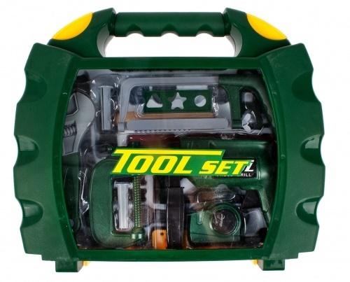 Zestaw zawiera: wiertarkę, piłka ręczna, taśma miernicza (wyciąga się), klucz nastawny, zaciskacz, młotek, klucz oczkowy, szpachelka oraz 16 różnych śrubek i nakrętek. Całość zapakowana w wygodną,