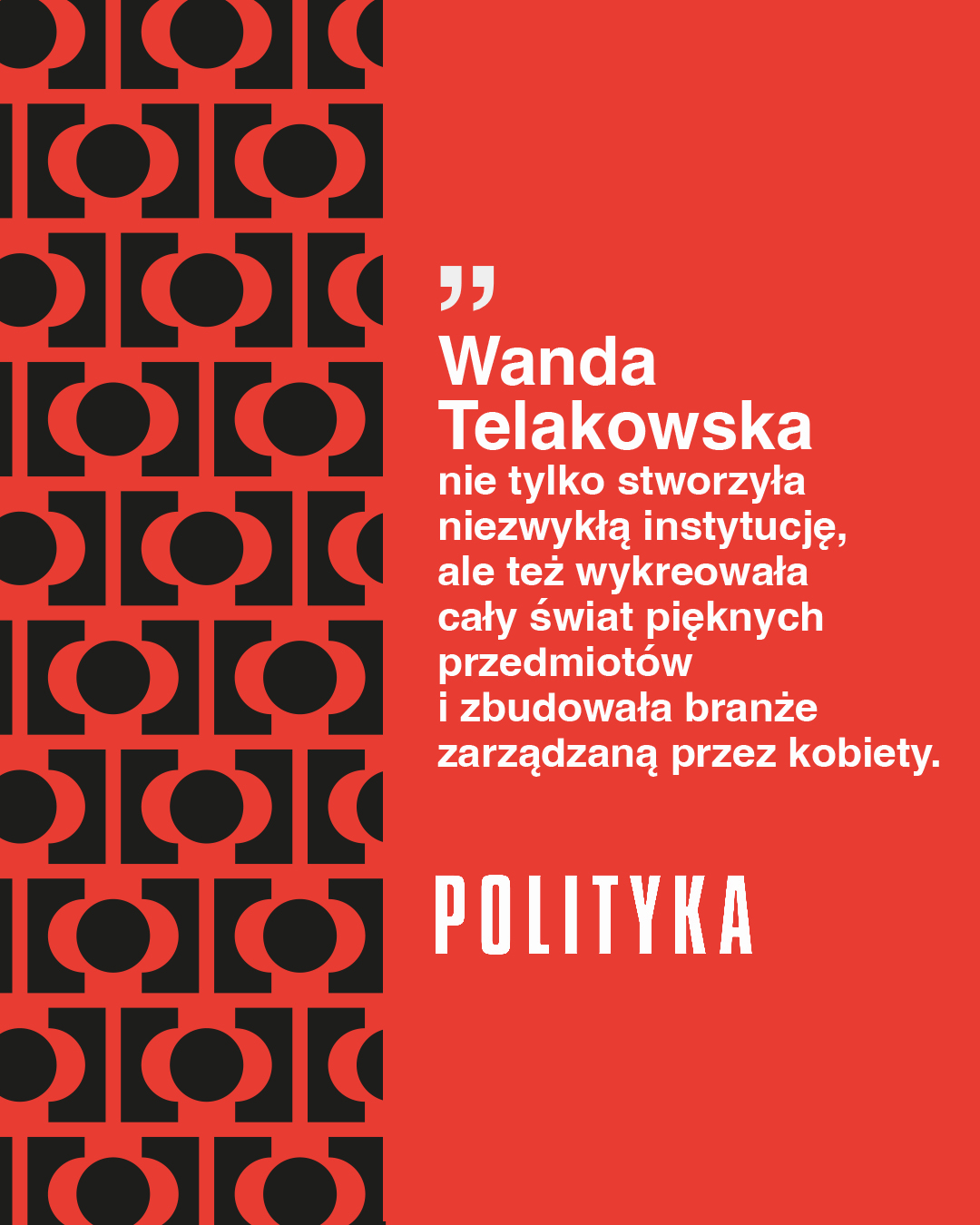 Pionierka i legenda. Najważniejsza postać polskiego wzornictwa powojennego. Jeśli istnieje "polski styl narodowy", to jego współczesną formę ukształtowała właśnie Wanda Telakowska. To, jak dziś mieszkamy, co kupujemy i co kolekcjonujemy, zawdzięczamy założonemu przez nią w 1950 roku Instytutowi Wzornictwa Przemysłowego, który stał się ewenementem na skalę światową: kuźnią wzorów na najwyższym poziomie, matecznikiem projektantów, szkołą gustów, a przy okazji miejscem pracy na miarę XXI wieku, przyjaznym kobietom.