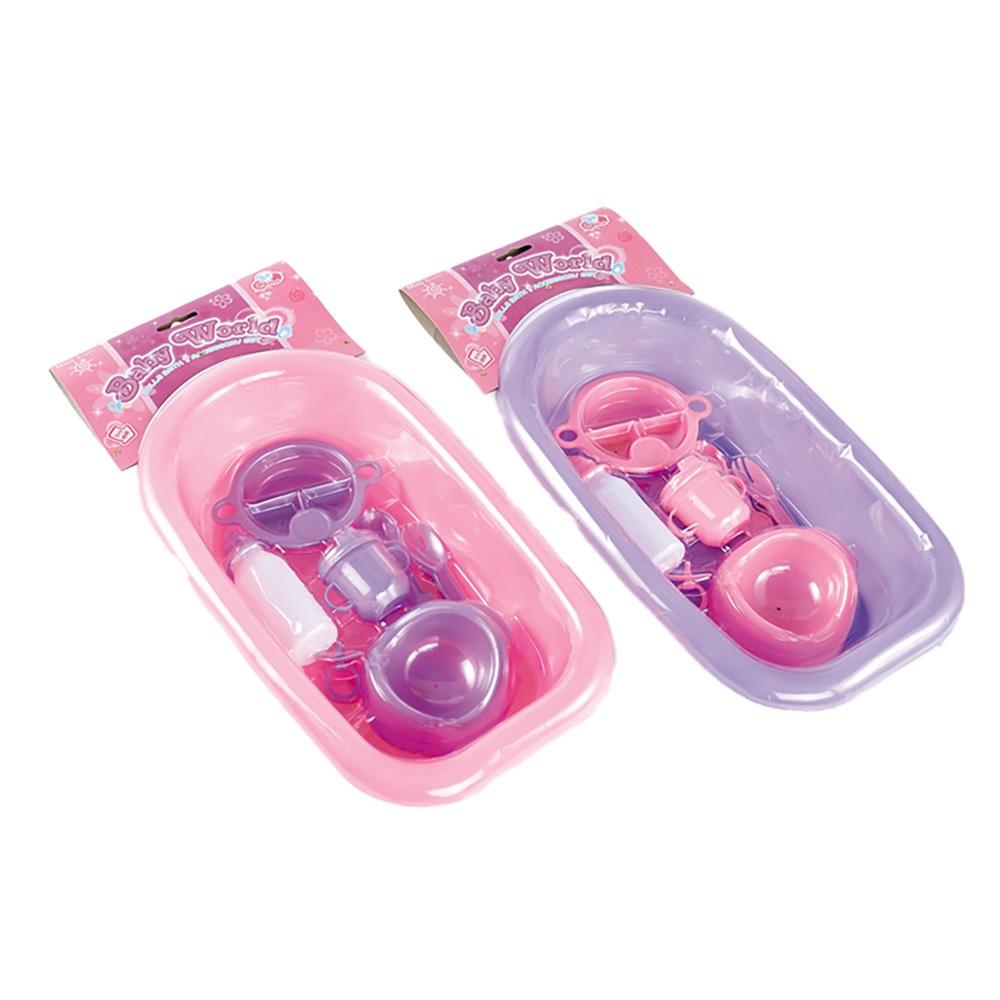 Wanienka dla lalek z akcesoriami: butelka, kubeczek, talerzyk, sztućce, nocnik