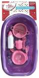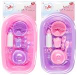 Zawartość zestawu: wanienka, nocniczek, miseczka z przegródkami, kubeczek niekapek, butelka z mlekiem, łyżka, widelec oraz smoczek. Całość wykoana z plastiku.