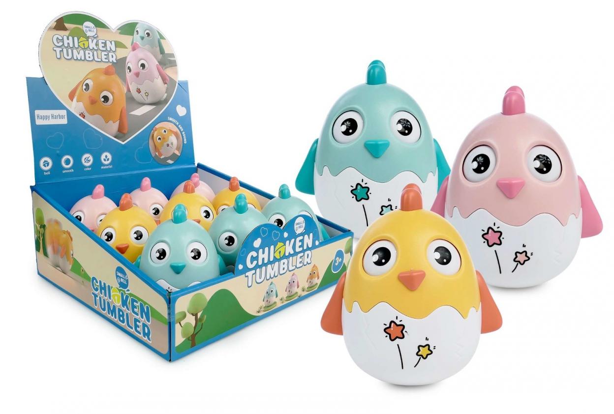 wys. kurczaka 12 cm, 3 kolory, wysyłka losowa. Funkcje: kurczaczek kołysze się na boki przy dźwięku dzwoneczków, ruchome oczy. Pozostałe informacje: wym. disp. 29,5 x 12,5 x 29 cm, wiek: 3+