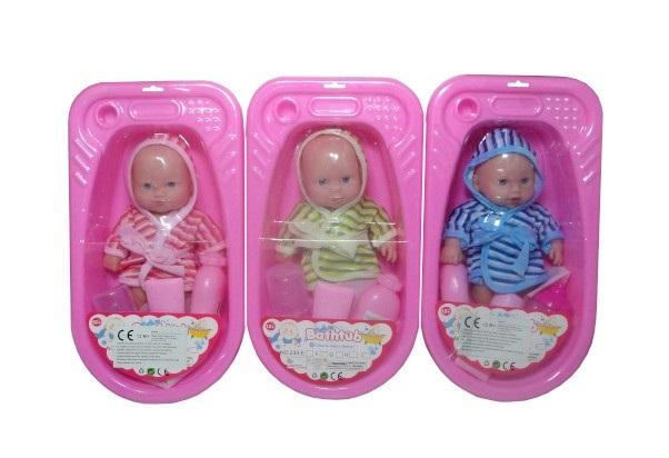 Plastikowa wanienka z lalką w szlafroku wraz z innymi akcesoriami do kąpieli jak: butelka, ręcznik, płyn do kąpieli . Zabawka rozwija u dziecka opiekuńczość, troskę o drugą osobę.#&Zabawka przykryta jest przezroczystym kloszem. #&Produkt dostępny dla dzieci od 12 miesiąca życia. #&Produkt występuje w kilku wersjach kolorystycznych, wybierany losowo. Cena dotyczy jednej sztuki. #&