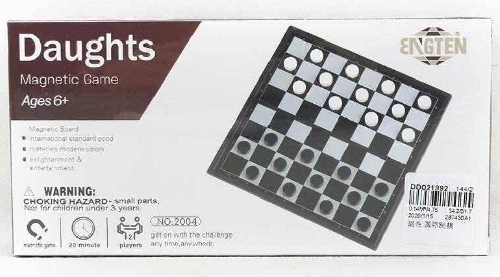 Warcaby magnetyczne 20 cm. Produkt nie potrzebuje baterii. Zabawka przeznaczona dla dzieci powyżej 6 roku życia.