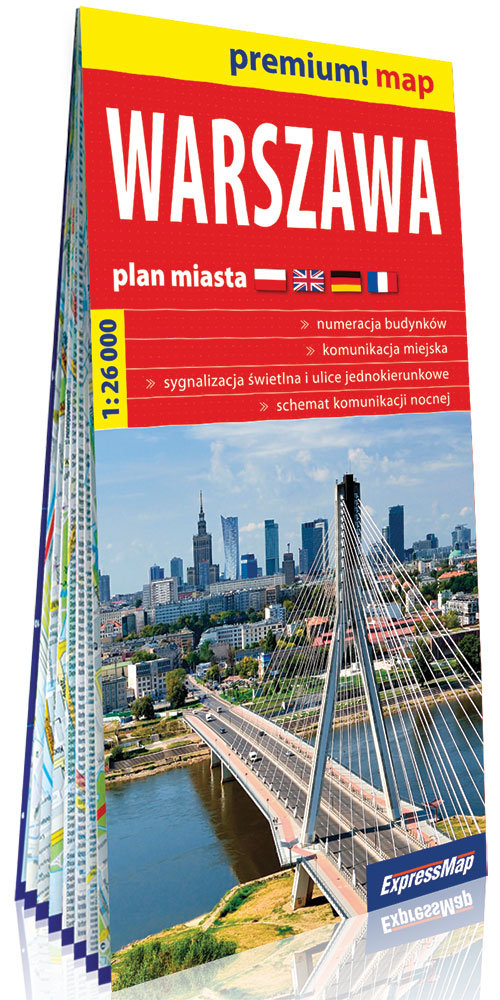 Warszawa Wjazd na 30. piętro Pałacu Kultury i Nauki, spacer uliczkami Starego Miasta, a może mecz lub koncert na Stadionie Narodowym? W stolicy każdy znajdzie coś dla siebie. Papierowa mapa Warszawy pomoże zaplanować udany pobyt. Publikacja zawiera ponadto plany Łomianek, Marek i Ząbek. Na mapie m.in.: • szczegółowy rysunek zabudowy wraz z numeracją budynków wzdłuż ulic i na osiedlach, • linie autobusowe i tramwajowe wraz z przystankami, linie metra, Szybkiej Kolei Miejskiej (SKM) i Warszawskiej Kolei Dojazdowej (WKD), • sygnalizacja świetlna, ulice jednokierunkowe, parkingi, • bogata treść turystyczna, m.in.: zabytki, muzea, hotele i inne istotne obiekty, • budynki użyteczności publicznej, centra handlowe, • szczegółowy plan centrum w skali 1:13 000 (1 cm – 130 m), • schemat nocnych linii autobusowych, • mapa strefy płatnego parkowania, • skorowidz ulic. Coś więcej niż tylko klasyczna mapa papierowa. Mapy z serii premium! map cechuje wytrzymałość oraz staranne wykonanie. Dzięki solidnej kartonowej okładce mapa nie pogniecie się w plecaku ani w schowku i na długo zachowa estetykę. W serii dostępne są plany miast oraz mapy samochodowe i turystyczne.