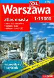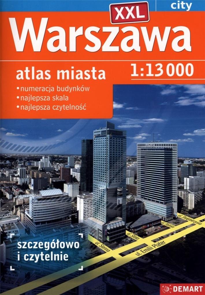 Skala: 1:13 000 Jeden z najlepszych dostępnych na rynku Atlasów Warszawy. Wyjątkowa skala 1:13 000 pozwoliła uzyskać wyjątkowo szczegółowe, a jednocześnie czytelne mapy. Pozwoliło to na zawarcie dokładnej numeracji budynków, pozwalającej lokalizować konkretne adresy. Dodatkowe informacje tematyczne i turystyczne, pozwalają lokalizować miejsca takie jak hotele, muzea, a także centra handlowe, poczty itp. Aktualna sieć ulic Warszawy zawiera nawet 29 nowo nadanych uchwałami z 2008 nazw ulic, oraz ukazuje najnowsze inwestycje, jak okolice lotniska Okęcie i przebicie ulicy Poleczki, projektowane trasy obwodowe. Plan komunikacji miejskiej ukazuje stan z 1.XI. 2008 – w tym całą linię metra Kabaty-Młociny i dopasowaną do niej komunikację autobusową.