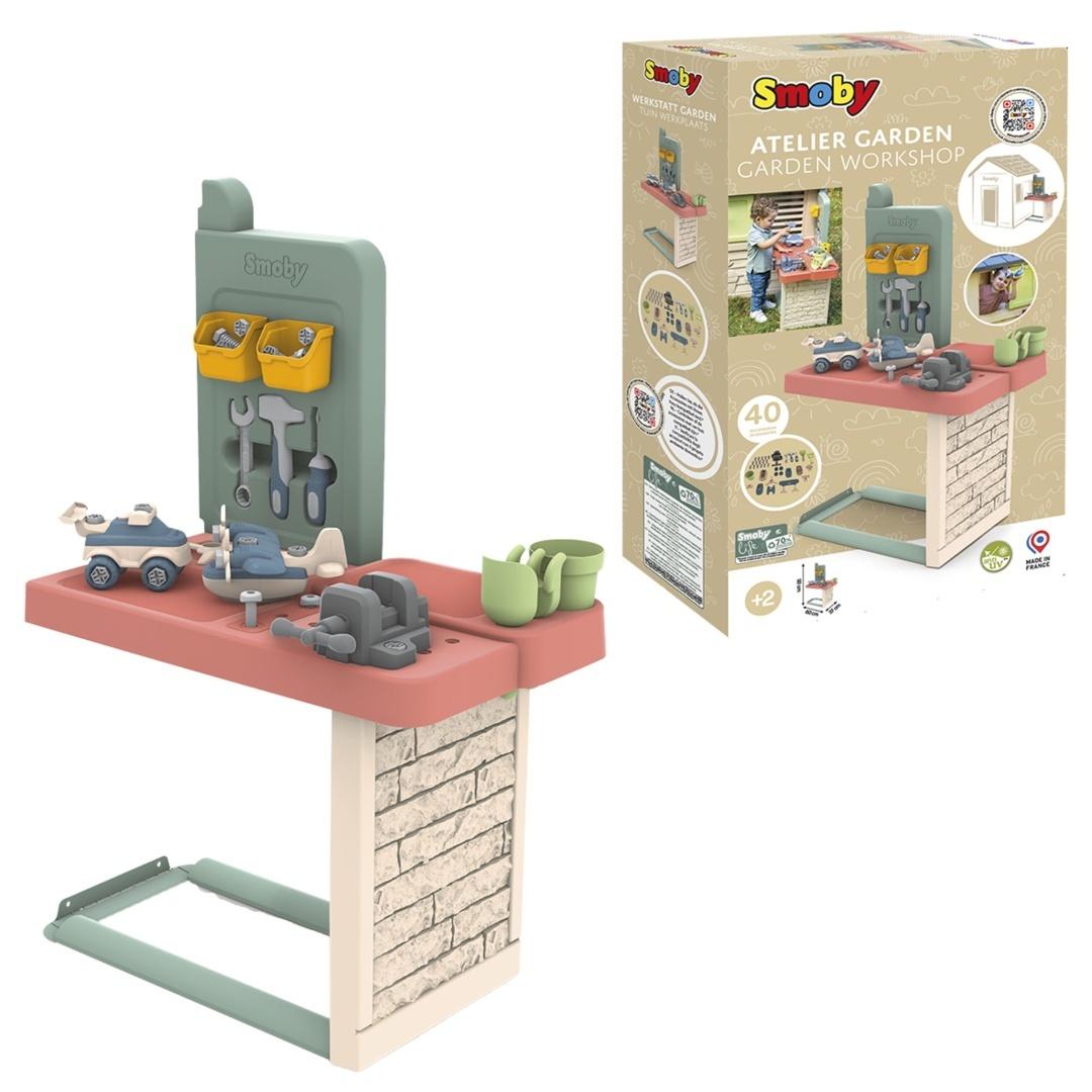 Smoby Life WarsztatnWarsztat małego majsterkowicza. 39 akcesoriów do zabawy w ogrodzie i majsterkowania. Z dołączonych akcesoriów i za pomocą załączonych narzędzi można zbudować samodzielnie 4 auta. Znaczna część użytego do produkcji plastiku pochodzi z recyklingu. Powłoka ANTI-UV chroniąca przed blaknięciem kolorów na słońcu. Wyprodukowane we Francji. Wymiary: 60x37x93 cm, 2l+