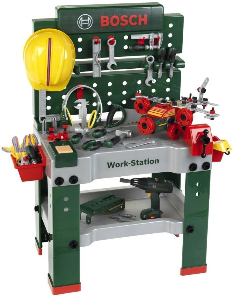 Największy warsztat marki Klein pochodzi z serii zabawek Bosch mini powstałej na licencji firmy Bosch, dlatego też narzędzia i akcesoria wchodzące w jego skład są wiernymi kopiami faktycznie istniejących. W zestawie zapakowanym w bardzo duży zielony karton Klein, znajdziemy aż 150 elementów konstrukcyjnych, narzędzi do zabawy, a także dodatkowo większą część dużego zestawu konstrukcyjnego (KL 8497) do zbudowania, przynajmniej 11 różnych pojazdów (samochód, samolot, helikopter, ładowarka, podnośnik, itp.) Zestaw KL 8497 także do kupienia osobno. Ponadto warsztat jest wyposażony w komplecie w wiertarko-wkrętarkę ze światłem i dźwiękiem (KL 8567), a także w kompletne elementy bezpiecznego ubioru małego majsterkowicza, czyli kask ochronny, słuchawki, okulary czy rękawice, będące częścią zestawu (KL 8537). Zarówno zestaw akcesoriów z kaskiem Bosch (KL8537), jak i wiertarko-wkrętarkę (KL 8567) można także kupić osobno. Głównym elementem tego największego zestawu do majsterkowania jest z pewnością szaro-zielony stół warsztatowy ze ścianą z czerwonymi haczykami i dwoma pojemnikami na narzędzia. Na pulpicie mamy do zamontowania specjalny kremowy przycisk/ włącznik, zasilany na baterie, po naciśnięciu którego wydobywa się odgłos charakterystyczny dla pracy warsztatu. Podstawowe narzędzia będące częścią tego warsztatu to czerwone imadło, młotek, kombinerki, piła, pilnik, trzy śrubokręty i ścisk stolarski. Zabawki te mają ciemno-zielone rączki, a ich wygodny uchwyt ma dodatkowo czarną profilowaną powierzchnię z logo Klein ułatwiającą utrzymanie narzędzia w dziecięcych dłoniach. Dodatkowo przy warsztacie znajdziemy jeszcze srebrny klucz płaski, klucz nasadowy, miarkę, suwmiarkę, poziomicę i kątownik, a także wiele innych drobnych elementów, jak śrubki, nakrętki, deseczki czy inne części konstrukcyjne do kreatywnej zabawy. Wszystkie elementy zestawu są wykonane z plastiku, pozbawione ostrych krawędzi i całkowicie bezpieczne dla dziecka. Ten niesamowity warsztat Bosch, dzięki licznym narzędziom, elementom ubioru i częściom do konstruowania to numer jeden na rynku wśród tego typu zabawek. Zestaw zawiera wszystko, czego mały majsterkowicz będzie potrzebował do konstruowania i innych drobnych prac, a został stworzony z dbałością o szczegóły i detale z wysokiej jakość materiałów, przez co wiernie naśladuje prawdziwe narzędzia i będzie służyć dzieciom przez długi czas. Dzięki warsztatowi dzieci w bezpieczny sposób będą mogły wcielić się w rolę majsterkowicza, zapewniając sobie realistyczne doświadczenie korzystania z wszystkich jego narzędzi. Dzieci uwielbiają naśladować rodziców wykonujących codzienne czynności domowe lub w nich uczestniczyć, jednak nie zawsze jest to możliwe ze względów bezpieczeństwa, a dzięki temu całkowicie bezpiecznemu dla dzieci, zabawkowemu warsztatowi z narzędziami każdy mały majsterkowicz może bezpiecznie robić to, co jego opiekunowie. Zabawka wymaga użycia baterii, które nie są zawarte w zestawie.
