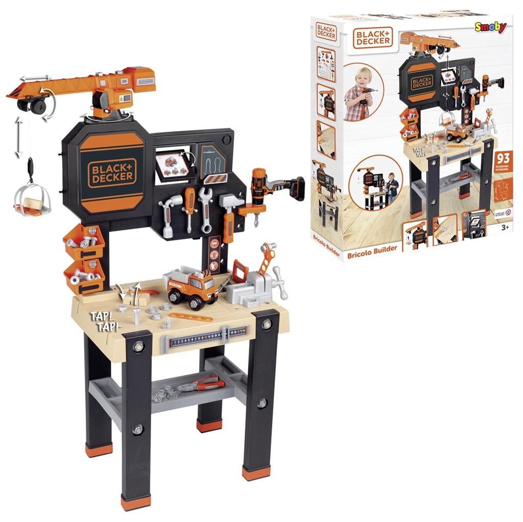 Realistyczny stół warsztatowy z dźwigiem do przemieszczania różnych elementów budowlanych, półkami. Zestaw zawiera 93 akcesoria, w tym 7 narzędzi: między innymi mechaniczna wkrętarka, śrubokręt, młotek, piła, kombinerki, imadło, ciężarówka do zbudowania oraz śruby, gwoździe i nakrętki. Wyprodukowane we Francji. Wymiary: 82 x 34 x 117 cm, 3 l+