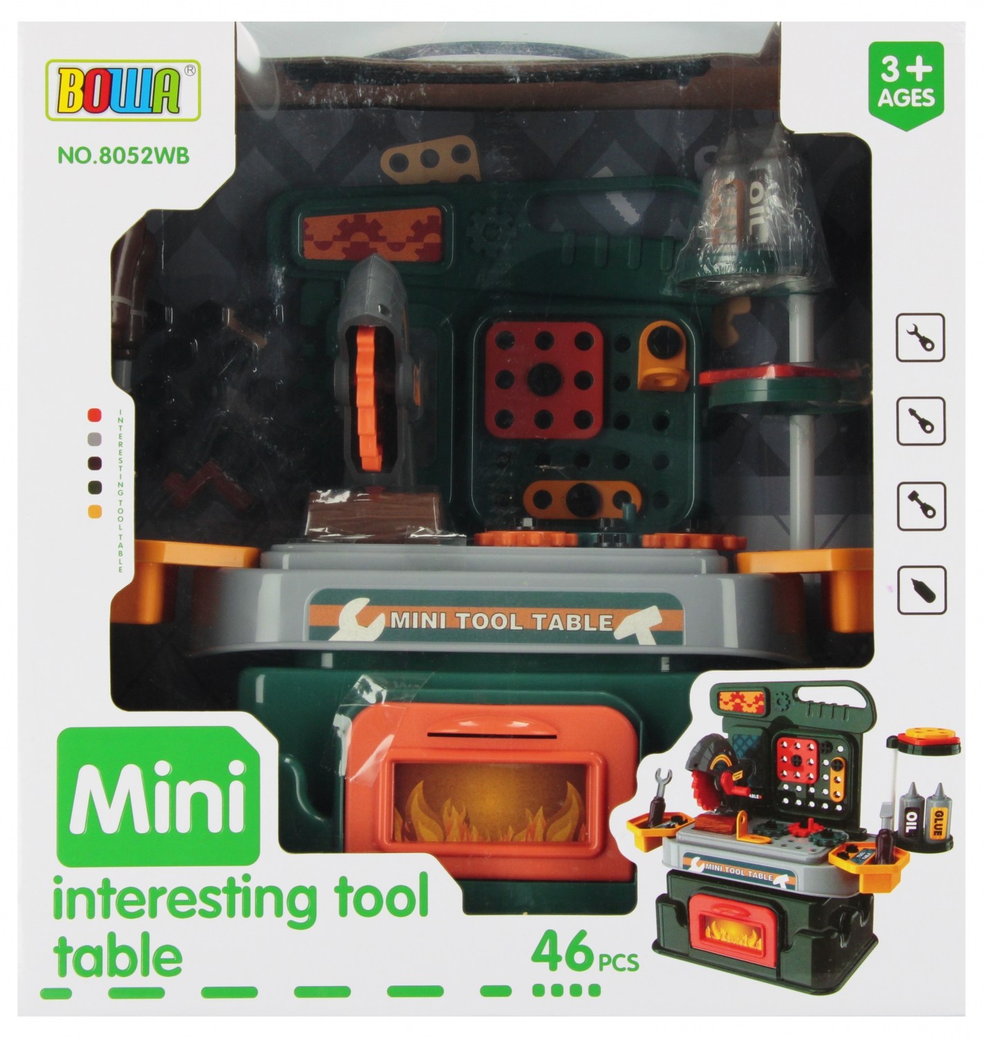 Zawartość zestawu to 46 elementów warsztat do majsterkowania z piecem, narzędzia oraz dodatkowe akcesoria tj. piła ręczna,