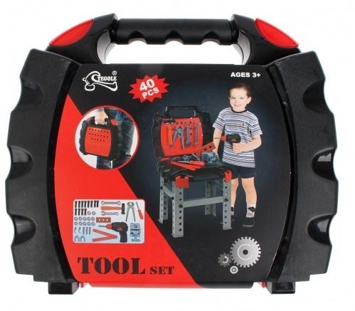 Zestaw zawiera: warsztat do majsterkowania, wiertarkę przy której po naciśnięciu czerwonego guzika obraca się wiertło, cęgi, śrubokręt, młotek, klucz oczkowy oraz 31 różnych śrubek i nakrętek. Zestaw zawiera 40 elementów.