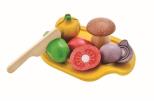 Zestaw smakowitych warzyw z nożykiem i deską do krojenia. Pomidor, papryka, szalotka, ogórek i grzybek mają w środku rzep, dzięki któremu można je kroić na pół i z powrotem składać w całość. 18m+