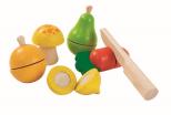 Znakomita zabawa dla małych kucharek i kucharzy! Każde warzywo składa się z dwóch części połączonych rzepem, który podczas krojenia specjalnym nożem wydaje apetyczne chrupnięcie. Zestaw zawiera pomarańczę, cytrynę, gruszkę, marchewkę, grzybek oraz nożyk. Produkt dopuszczony do obrotu w UE zgodnie z posiadanym certyfikatem CE oraz zgodnością z normą EN-71. Dla dzieci w wieku od 18 miesięcy