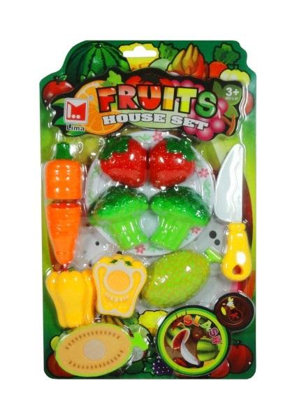 Zestaw owoców i warzyw do krojenia wraz z nożem i talerzykiem. Owoce i warzywa to m. in.: truskawka, brokuł, marchewka, papryka. Produkt zapakowany w przezroczyste opakowanie. Zabawka dla dzieci od 3 lat. Podane wymiary są wymiarami opakowania.
